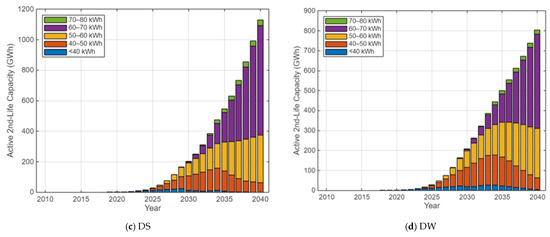 Usable second life capacity by batteries’ capacity in: (a) ES; (b) EW; (c) DS; (d) DW scenarios.