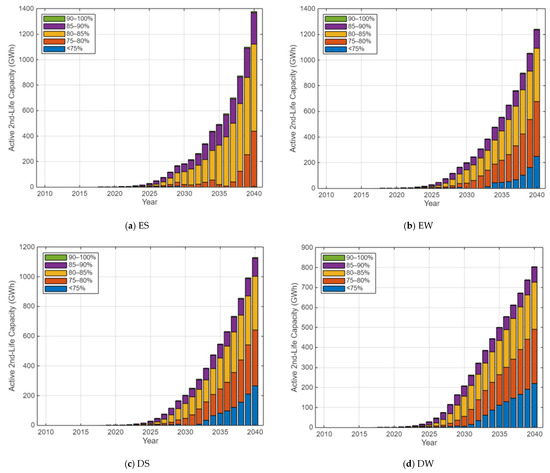 Usable second life capacity by batteries’ SoH in: (a) ES; (b) EW; (c) DS; (d) DW scenarios.