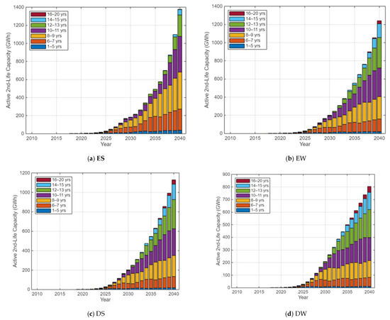 Usable second life capacity by batteries’ age in: (a) ES; (b) EW; (c) DS; (d) DW scenarios.