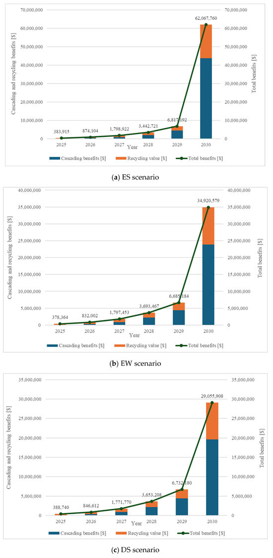 Due to material price fluctuations, this study estimates the total benefits [$] of recycling the EV batteries in the timeframe 2025–2030 for the analyzed scenarios: ES, EW, DS and DW. The total benefits are calculated as a sum between the cascading benefits, for the retired EV batteries that are reused in second-life applications [48], and the recycling value. The cascading benefits of repurposing EV batteries consider the remaining usable capacity at the end of the first life and the unit revenue of 85.41 $/kWh for the analyzed period [49]. The recycling value is based on the usable capacity remaining at the end of second life and has different values, depending on the battery chemistry. For LCO, LFP, LMFP and LMO chemistries the unit revenue is 21.93 $/kWh, and for NCA, NMC111, NMC271, NMC523, NMC622, NMC721, NMC811 and NMC955 the unit revenue is 37.91 $/kWh, while for Na-ion chemistry the unit revenue is considered 0 $/kWh [50].