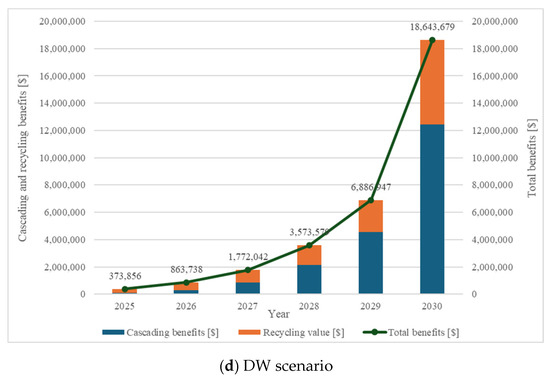 The cascading, recycling and total benefits of retired EV batteries for scenarios: (a) ES, (b) EW, (c) DS, (d) DW.