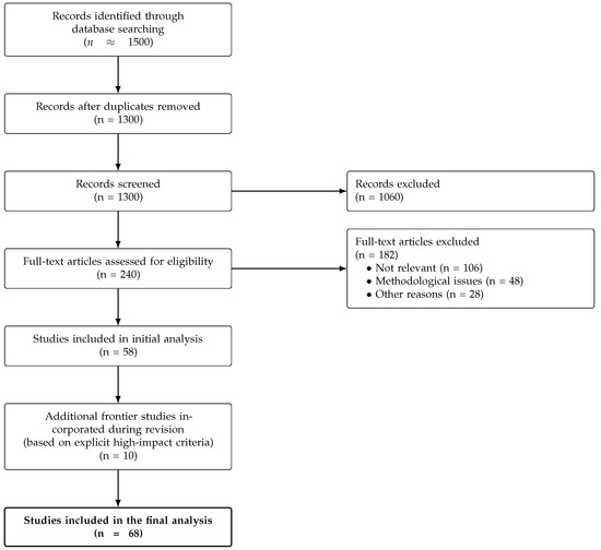 PRISMA flow diagram of the study selection process. The final corpus includes an additional set of frontier studies (n = 10) incorporated during revision based on explicit high-impact criteria described in the Survey Methodology section.
