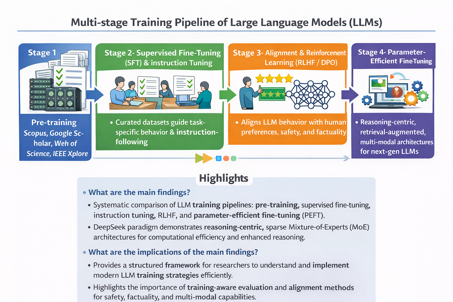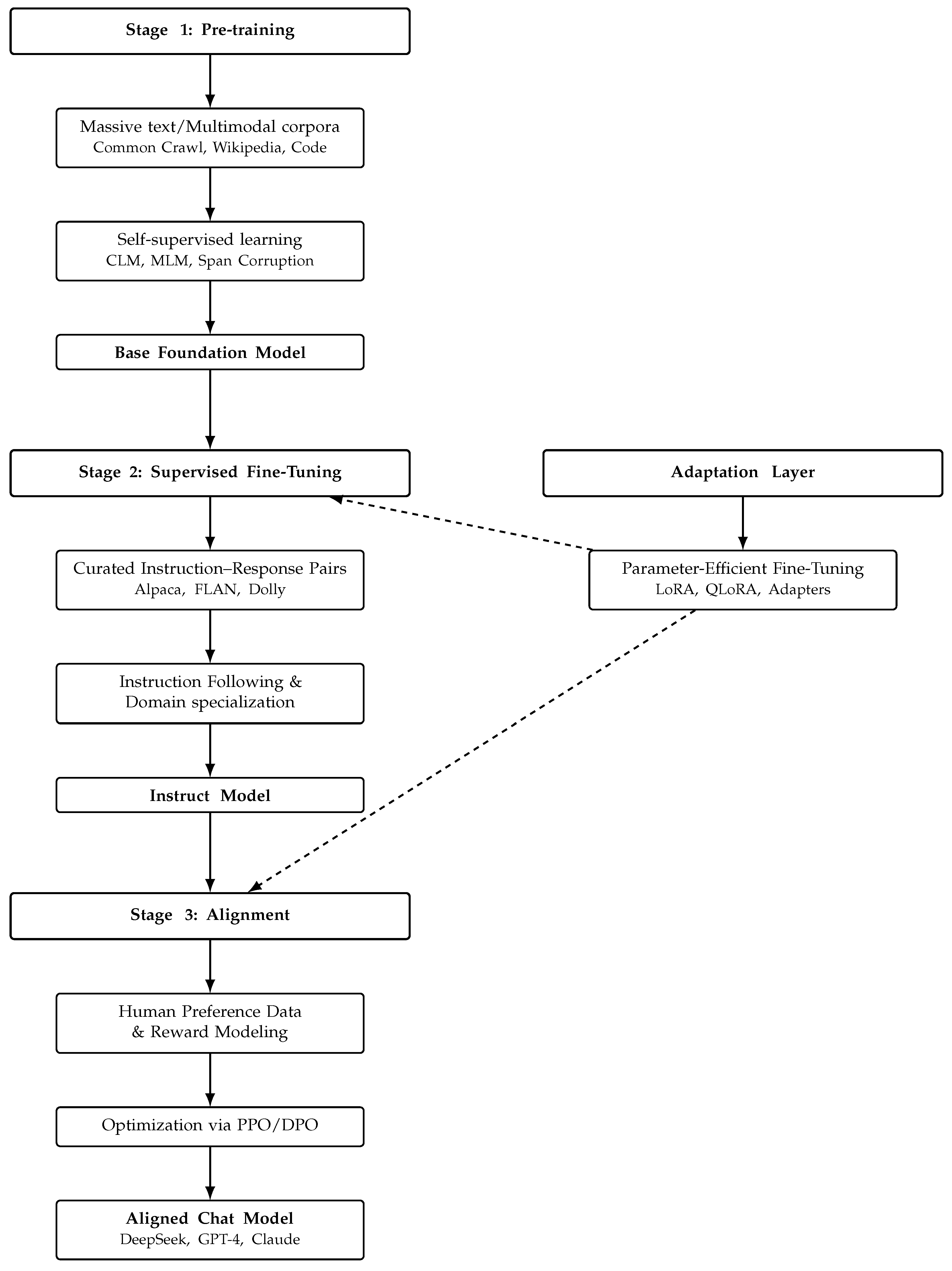 | Supervised Fine-Tuning (SFT) | Task-specific supervised training on labeled datasets | Improves task performance; better instruction-following | Limited generalization; expensive to curate large labeled datasets | FLAN-T5, Qwen | [22,23] |