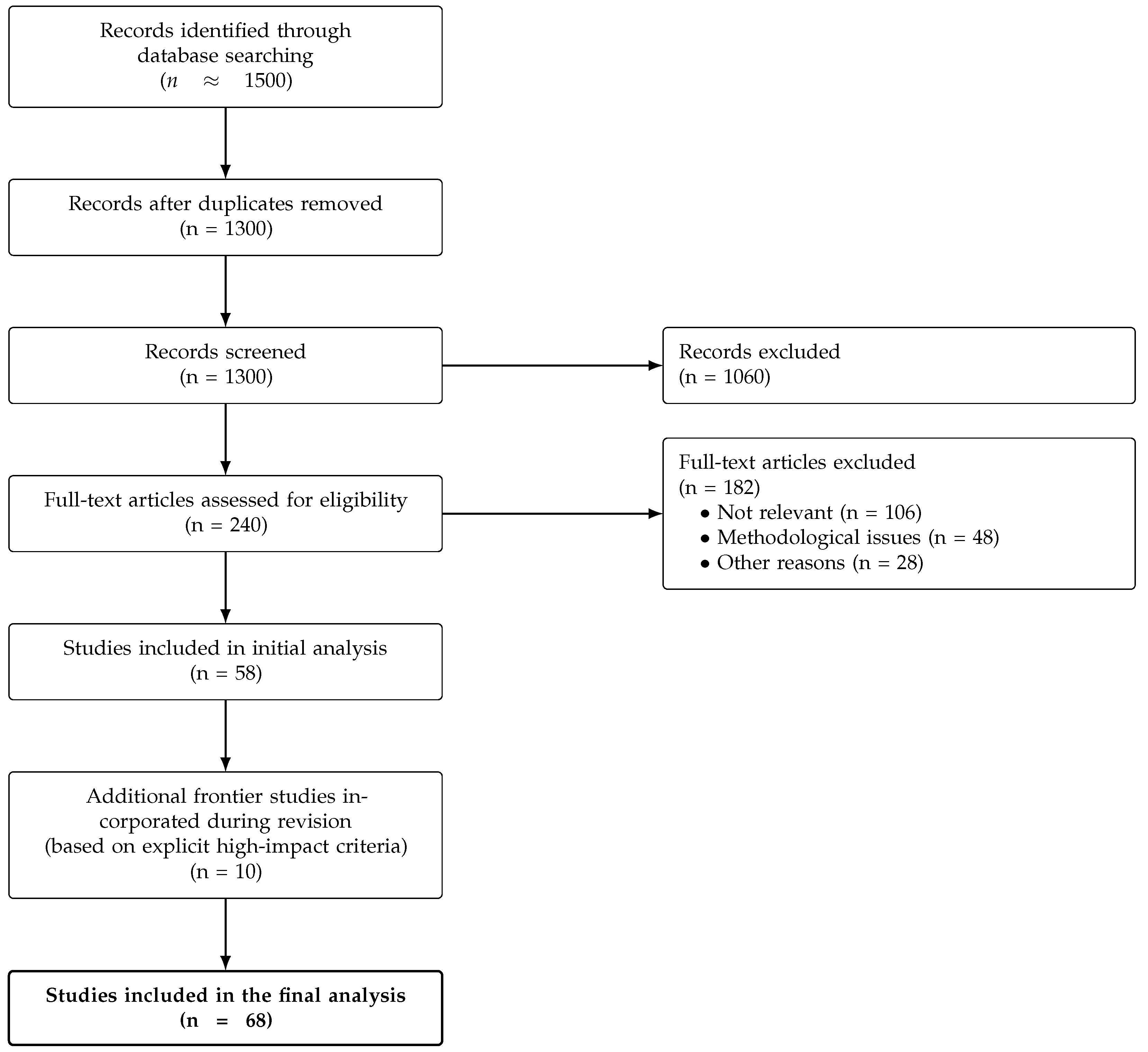 - Systematic methodological synthesis: We adopt a transparent survey methodology and organize an initial set of 58 core studies, expanded to 68 during revision, across major stages of the LLM training pipeline, supported by PRISMA-style reporting and thematic distribution.