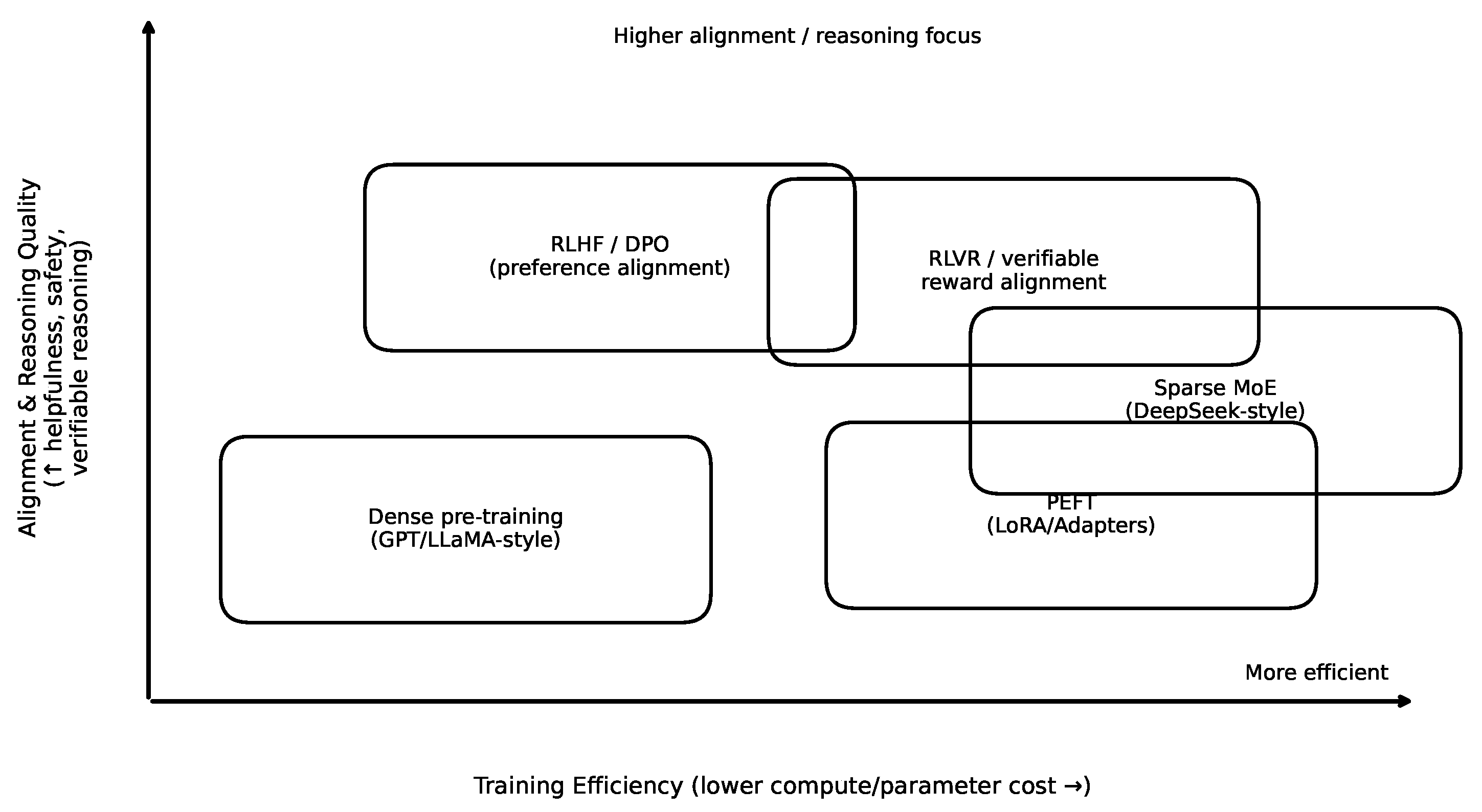 - Unified analytical taxonomy: Beyond thematic review, we propose an original comparative framework positioning training paradigms along the axes of training efficiency and alignment/reasoning quality, offering new insight into dense scaling versus sparse and post-training optimization strategies.