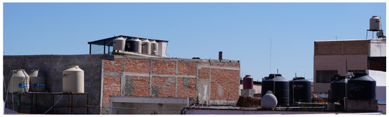 In the vast majority of homes in urban and rural areas of Mexico, drinking water is stored in water tanks and/or cisterns due to the IWS problem. These tanks are installed on the roofs of each house, where the municipal public water supply enters directly, providing this resource for residents’ daily activities, as shown in Figure 1.