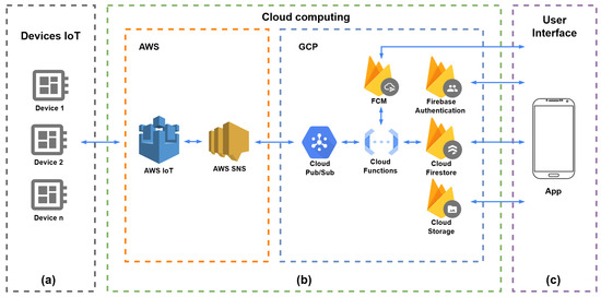 The design and development of the proposed SWMMS are based on an IoT architecture divided into three main parts (Figure 2): IoT devices (Figure 2a) that measure and monitor water consumption and supply events in real time. The second part consists of cloud computing services (Figure 2b) for data storage, processing, and analysis, and a mobile application (Figure 2c) that provides an intuitive user interface for decision-making in homes with IWS. This application allows users to register homes and water tanks, view available volume in real time, consult consumption history, and receive alerts for prolonged consumption time, water tank overflow, low water level, and low battery level of the IoT device.