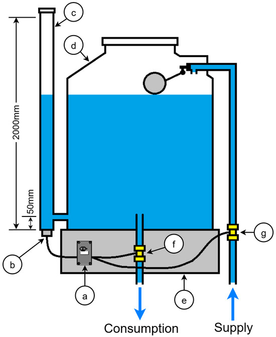 Design and installation of the SWMMS: (a) IoT device, (b) Ultrasonic sensor, (c) Water column, (d) Water tank, (e) Metal or concrete base supporting the water tank, (f) Flow switch in the consumption pipe, (g) Flow switch in the supply pipe.