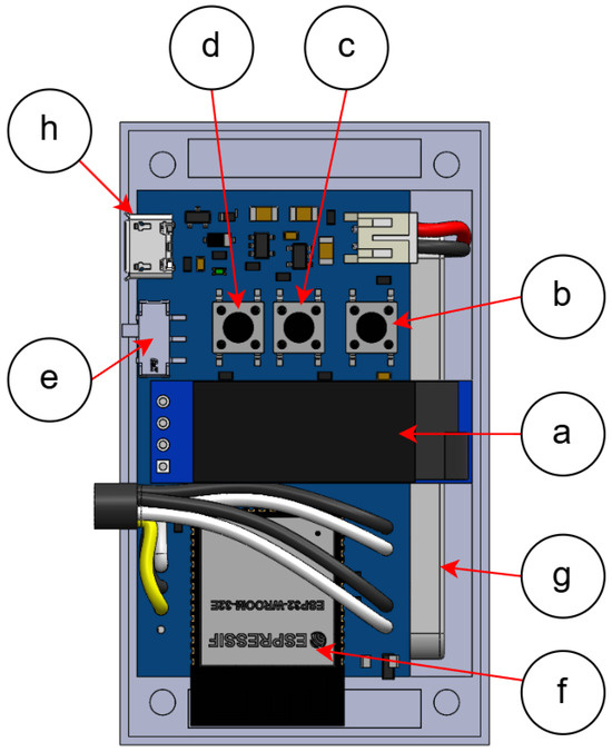 PCB: (a) 128 × 32 OLED display, (b) reset tactile switch, (c) “b2” tactile switch, (d) “b1” tactile switch, (e) SPDT slide switch (IoT device power on/off), (f) ESP-WROOM-32E module, (g) Rechargeable battery, (h) Micro USB B 2.0 connector.
