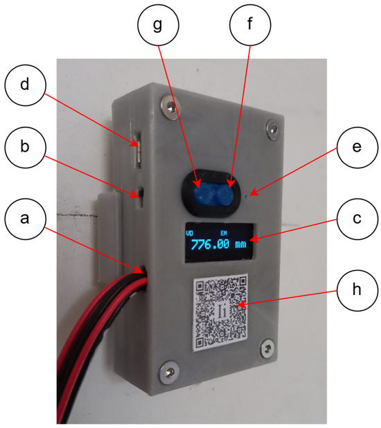 A prototype enclosure (Figure 6) was designed to protect the PCB and battery electronic components, accounting for environmental conditions at the IoT device’s installation site (on the rooftop of the house), including humidity, dust, direct sunlight, and potential mechanical impacts. The design was created in SolidWorks 2022, enabling precise modeling of the electronic assembly dimensions and optimizing the internal space to accommodate the PCB and battery. The enclosure design includes openings for the sensor connection cables (Figure 6(a)), the power switch (Figure 6(b)), the OLED display (Figure 6(c)), the micro USB B 2.0 connector (Figure 6(d)) for charging the device, and the touch switch for reset functions (Figure 6(e)). Two buttons were included for the “b2” tactile switch (Figure 6(f)) and the “b1” tactile switch (Figure 6(g)). The casing was manufactured using FDM (Fused Deposition Modeling) 3D printing with PETG (Polyethylene Terephthalate Glycol) filament, selected for its low cost, impermeability and resistance to Ultraviolet (UV) radiation, slightly superior to PLA (Polylactic Acid) and ABS (Acrylonitrile Butadiene Styrene) filament, making it suitable for prototypes with undemanding electronic applications and prolonged exposure to the outdoors [55].
