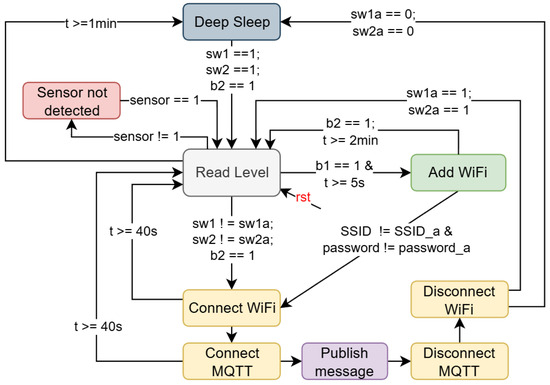 The control algorithm implemented in the IoT device is based on a finite state machine consisting of nine states: read level, sensor not connected, add WiFi, connect WiFi, connect MQTT, publish message, disconnect MQTT, disconnect WiFi, and deep sleep (Figure 7), which allow it to control the flow of operation of the IoT device, manage wireless communication, publish the message to cloud computing services, and optimize energy consumption through deep sleep mode.