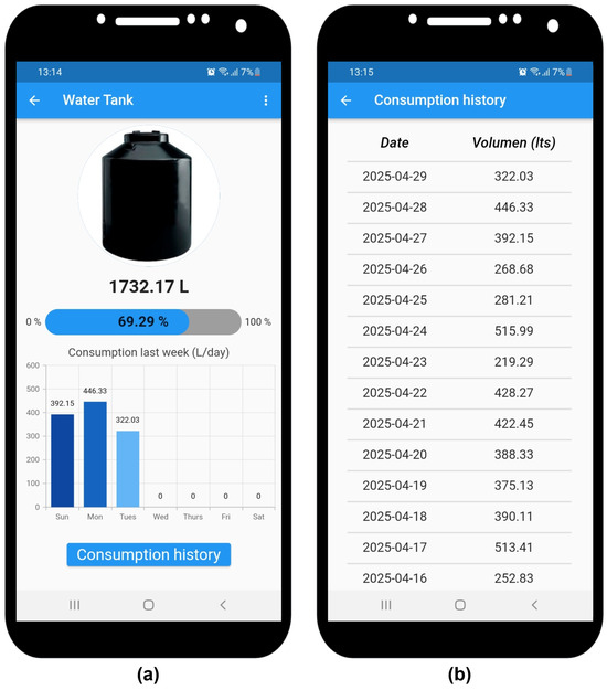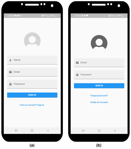 A mobile application for smartphones was developed as a user interface using the Flutter SDK (Software Development Kit, version 3.27.1) and the Dart language, allowing deployment on both Android and iOS devices. This mobile application will enable users to manage their IoT devices, view the amount of available water in liters, and access a real-time history of daily water consumption, enabling more efficient water use. It also notifies users about prolonged consumption time, tank overflow, low water level, and low battery on the IoT device. The first time a user accesses the mobile application, they must create sign up (Figure 8a). Once the account is created, the user can sign in (Figure 8b) by correctly entering their registered email address and password. If these values are incorrect, an alert will be displayed with the message “Enter a valid email address and password”.