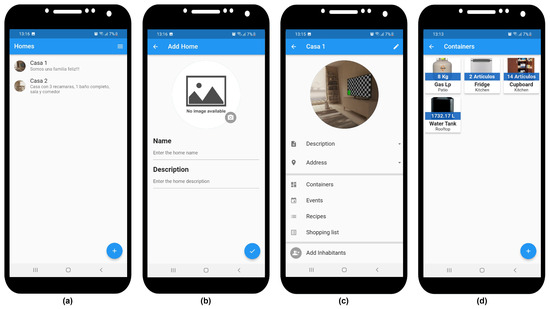 In the homes list page (Figure 10a), the user can see the houses where they are registered as a resident. By clicking the “Add (+)” button located in the lower right corner of the screen, they will be taken to the “add home” page (Figure 10b) where they will enter the name and description of the house, as well as an image of the house, choosing from an image in their gallery or taking a photo with their mobile phone camera. The house will be added upon pressing the “Accept (✓)” button. The home page (Figure 10c) will display the property image, description, residents, containers, events, recipes, shopping list, add residents, and edit home. Users with the administrator title can edit the home description, delete residents, and be promoted or demoted to or from the administrator role. The containers page (Figure 10d) displays all registered containers for the home in a grid format. Users can create new containers by clicking the “add (+)” button in the bottom-right corner of the page.