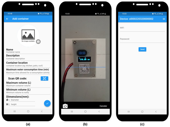 On the Add Container page (Figure 11a), the user will enter the necessary information to create the container (water tank), such as: name, description, its location in the home, the minimum and maximum volume of the container (to alert the user about low water levels and tank overflow), maximum water consumption time (maximum time, in minutes, for the prolonged consumption time alert), and the dimensions (the diameter and height of the tank). By pressing the “Scan QR code” button, the user can scan the IoT device’s QR code (Figure 11b), which contains essential information such as the IoT device’s serial number and type, necessary to register the IoT device with the home. If the device has already been registered, the application will display an alert with the message: “This device has already been registered.” However, if this IoT device has not been registered, the user will be directed to the “Add WiFi” page (Figure 11c), where they will enter the SSID and password of the home WiFi network. The IoT device will be added to the home by pressing the “accept (✓)” button.