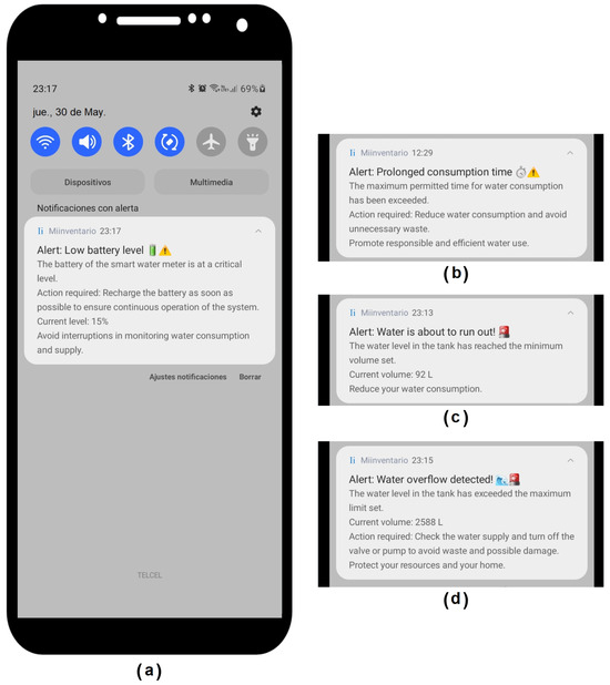 Figure 13. (a) Alert: Low battery level. (b) Alert: Prolonged consumption time. (c) Alert: Water is about to run out. (d) Alert: Water overflow detected. - Prolonged consumption time!: This alert is sent when the duration of a consumption event exceeds the maximum time allowed for a consumption activity, previously configured by the user (Figure 13b);