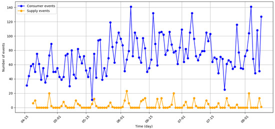 Graph of the number of consumption and supply events per day, from 16 April to 9 August 2025.