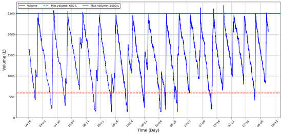 The maximum capacity of the water tank (red horizontal line) of 2500 L was exceeded on seven occasions (28 April; 5 and 12 May; 8, 14, and 19 July; and 8 August), indicating the days when the water pressure was sufficient to cause the tank to overflow, resulting in water loss and damage to the float valve caused by the IWS. On the other hand, a decrease in the number of events and duration of consumption was observed when the water volume fell below 600 L (minimum volume: red dashed horizontal line) on 21 occasions.
