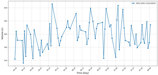 Figure 14 shows the daily number of consumption events (blue curve) and supply events (orange curve) recorded from 16 April to 9 August 2025. During the first 40 days of monitoring (16 April to 25 May), a lower number of consumption events was observed due to a temporary change in behavior, associated with users’ awareness of being monitored, a phenomenon known as the Hawthorne effect [58,59]. After the 40 days (26 May to 15 July), an increase in the average daily number of consumption events was observed, from 55.8 to 85.9, reflecting a gradual normalization of habitual water use patterns as users become accustomed to the system and their perception of being observed decreases.