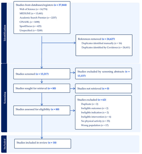 A total of 37,844 articles were initially imported into Covidence for screening. The PRISMA flowchart and the selection procedure are shown in Figure 1. In total, 24,611 duplicates were identified and removed by Covidence and 16 were eliminated manually. Following title and abstract screening, 13,137 of the resulting 13,217 articles were excluded. The full texts of the remaining 80 records were assessed for eligibility, and 62 were excluded. Thus, a total of 18 studies met the inclusion criteria and were included in the review; 39% of those articles were published in Asia (n = 7), 33% in the United States (n = 6) and 28% in Europe (n = 5). Half of the articles were written in the 2010s and the other half in the 2020s. More than half of the articles (n = 10, 56%) included cycling as the VR intervention. Other LTPA were explored: three studies used sailing (17%), two used canoeing (11%), one used soccer, one used Pilates, and one used boxing (5.5% each). Study designs included seven feasibility, pilot, preliminary, or exploratory studies; six randomized control trials; three usability/development studies; and two studies with a comparative/quasi-experimental design. Sixteen studies employed only quantitative analyses, and two used a mixed-methods design. Most of the participants included in the reviewed articles had had a spinal cord injury or stroke. Five articles (28%) reported on work focusing exclusively on participants with stroke and four (22%) on participants with spinal cord injury. One article included a mixed population of participants with stroke, cancer, spinal fracture, and neurological conditions [28], while two included participants with both spinal cord injury and cerebral palsy [29,30]. The other conditions present in the study samples included Parkinson’s disease, multiple sclerosis, lower limb disorders, motor polyneuropathy, ataxia and hemiparesis.