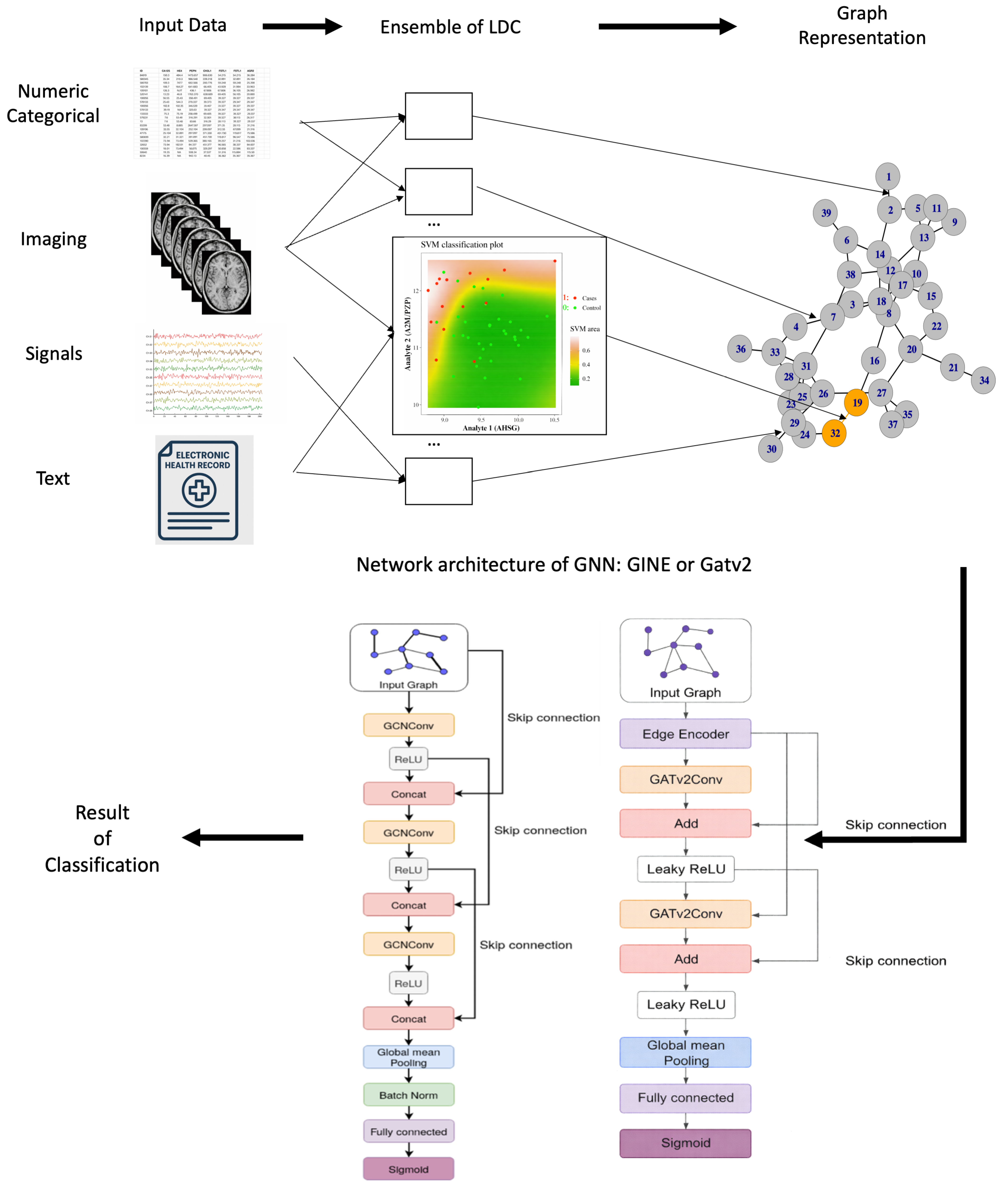 - GNN Training. We train two Graph Neural Networks—GCN and GATv2—on the resulting graphs to perform classification. For each model and task, we use training parameters selected individually via hyperparameter optimization with the Optuna framework [38].
