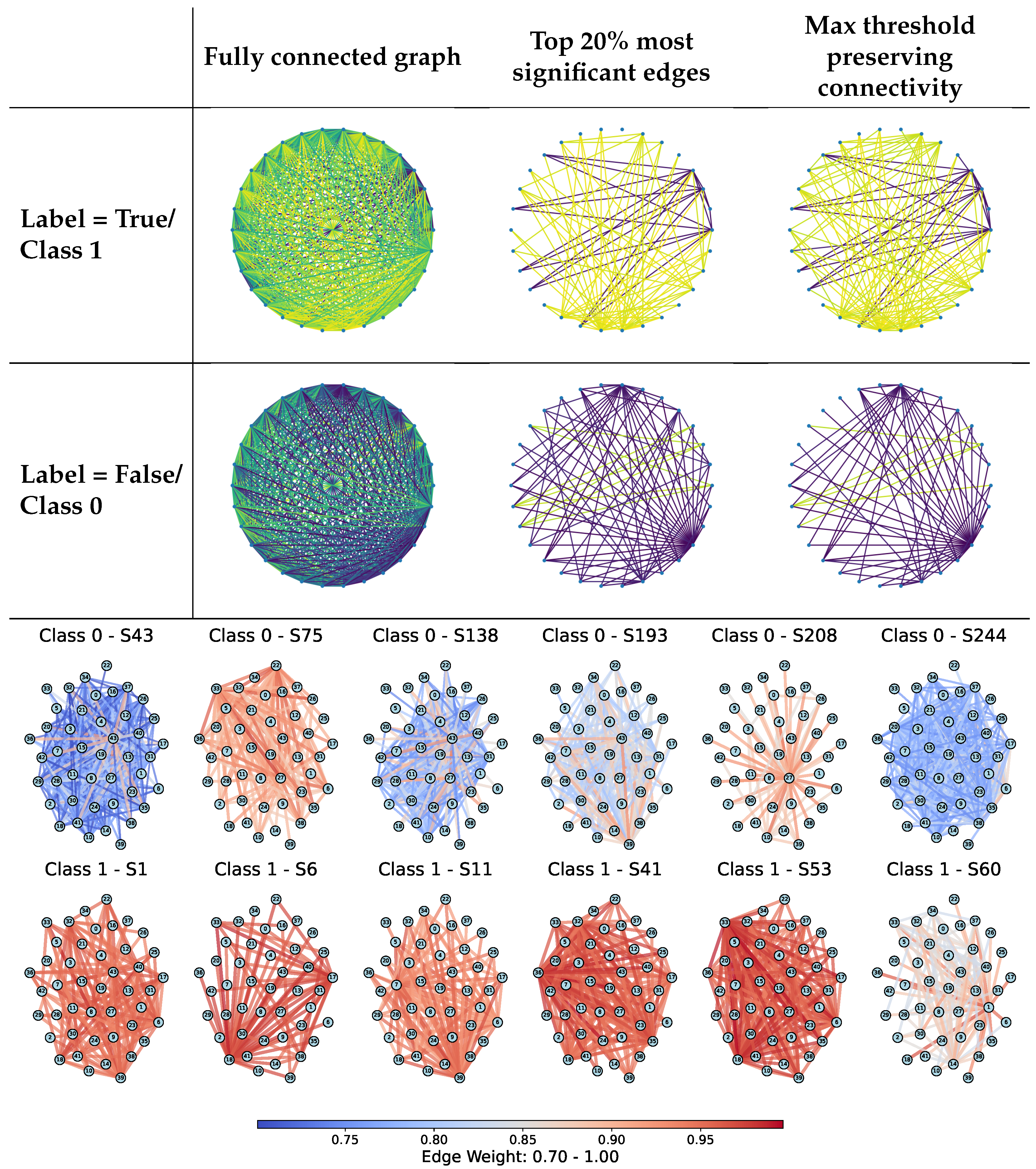 - Threshold-based sparsification: Retains a fraction p of the most significant edges based on the criterion , where is the edge weight. This approach allows control over graph sparsity while preserving connections with the greatest deviation from the neutral value 0.5.