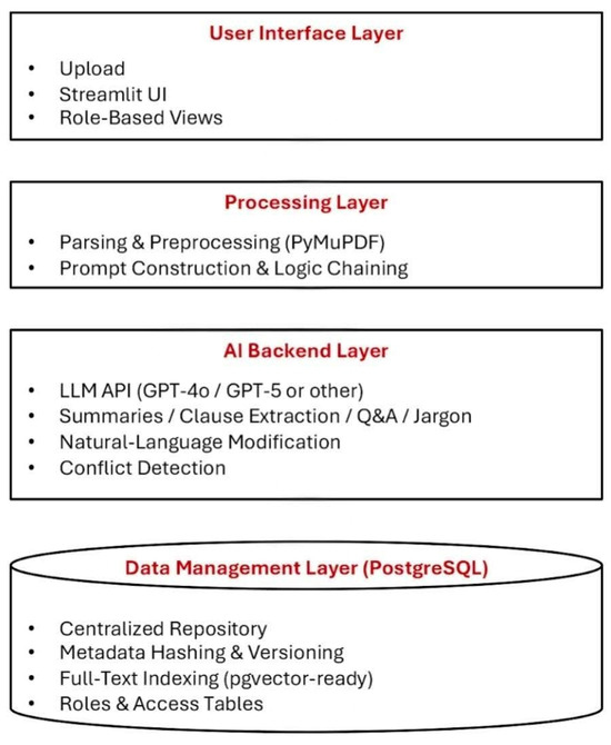 The proposed AI-based Agreement Management System (as seen in Figure 1) is designed as a modular system to ensure scalability, maintainability, and secure contract analysis [28,29]. The modular approach enables independent development of subsystems while supporting future extensions such as automated breach detection and finance integration. A description of the distinct layers is provided below: