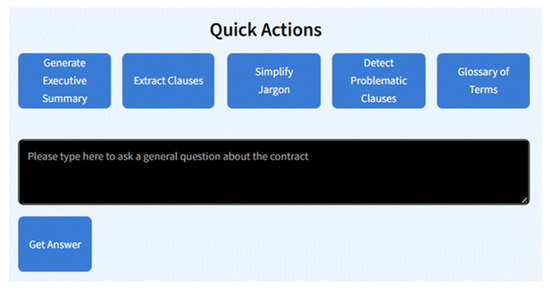 Figure 3. Quick action buttons and natural language question interface. - User Query Handling: Open-ended user questions are managed by a logic-chaining mechanism. This constructs layered prompts that combine the user’s query with the document’s full content and extracted metadata, ensuring the LLM delivers accurate, context-aware responses. For instance, a user can input: “What happens if the project is terminated before the effective date?” and the system will provide a direct answer based on the contract content.