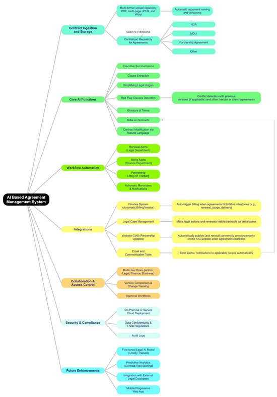 The developed components of the AI-based Agreement Management System, specifically the Core AI Functions, Contract Ingestion and Storage, and Collaboration & Access Control modules (as outlined in the system roadmap in Figure 5), collectively establish a robust, enterprise-ready foundation for managing legal assets. The successful real-world testing at AlFaris International Group definitively validated the platform’s utility, confirming its effectiveness in core tasks like clause extraction, summarization, and natural-language editing, as noted in the results.
