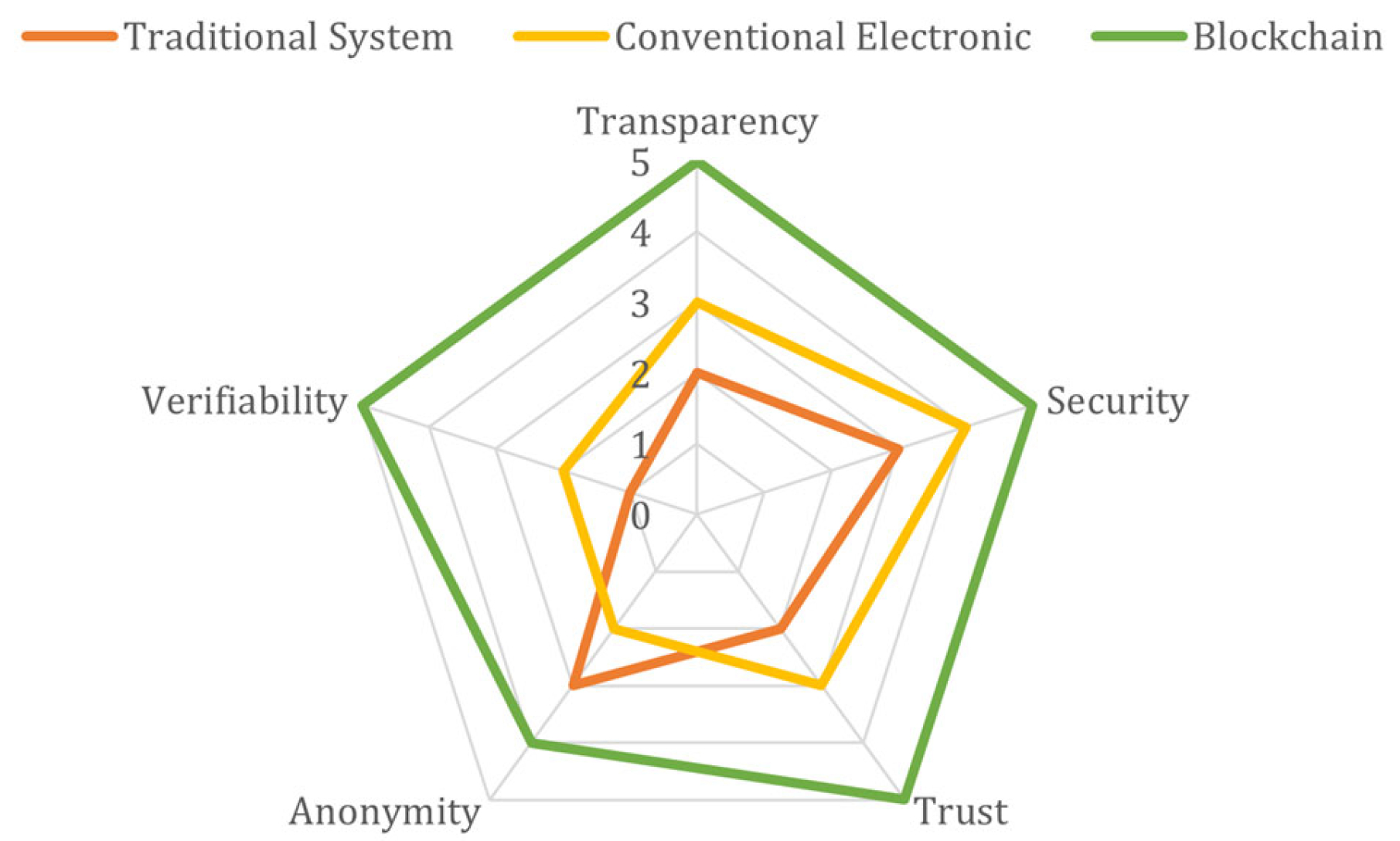 To compare the capabilities of traditional voting systems, conventional electronic systems, and blockchain-based systems, a radar chart has been constructed (see