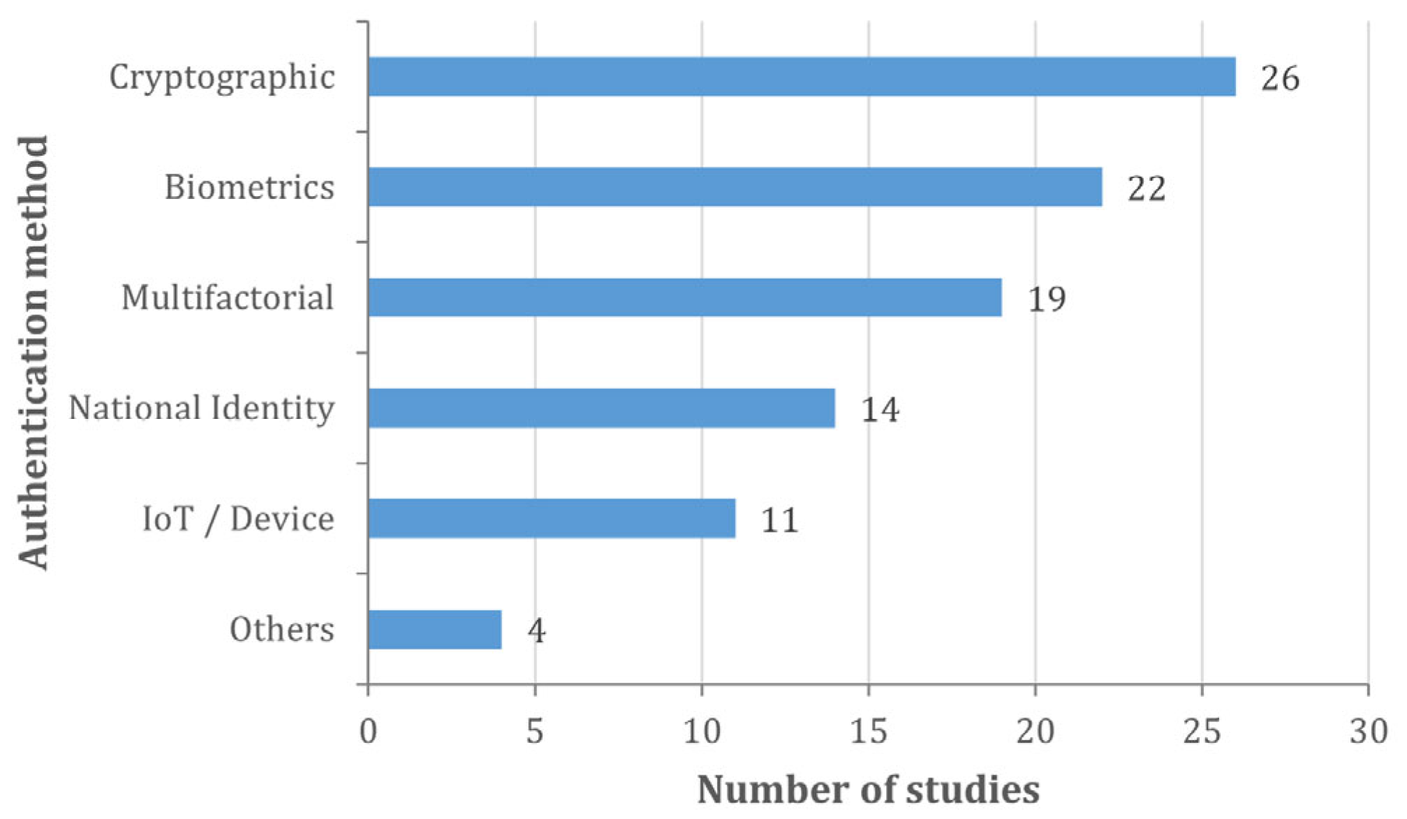 Figure 8 visually summarises the frequency with which the different approaches appear in the included primary studies, based on the following main categories of authentication: