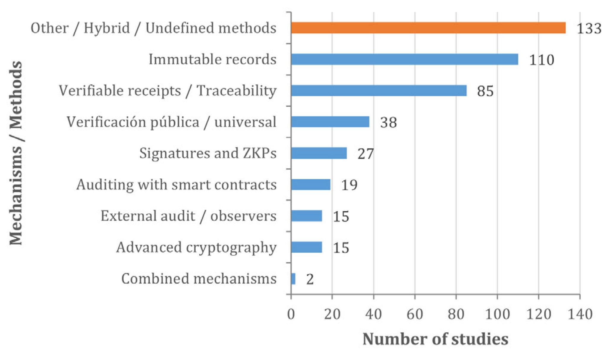 Figure 9 visually summarises the frequency with which the different verification and audit mechanisms or methods appear in the included primary studies, grouped into the following main categories: