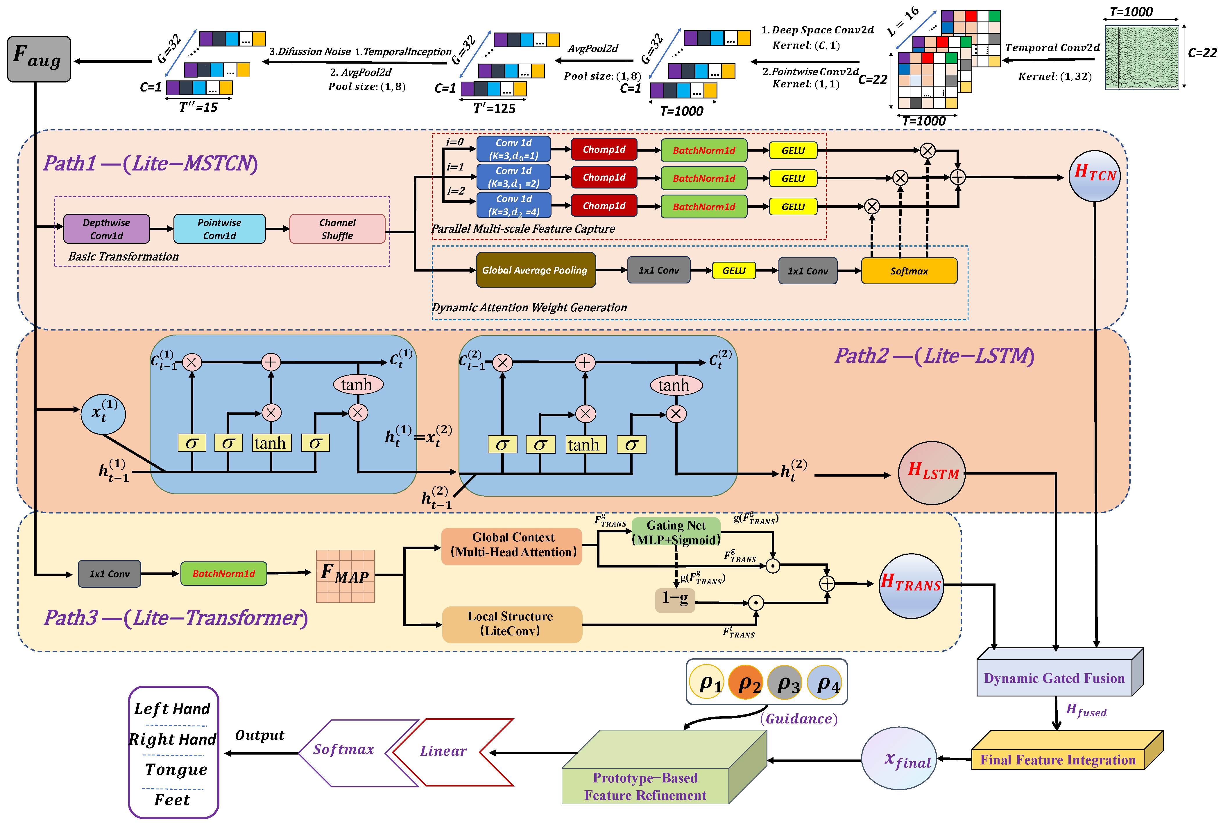 This entire pipeline, from the dynamic gating fusion to the prototype-guided classification, collectively ensures that the model maximally utilizes the heterogeneous temporal features from multiple paths and leads to highly robust and accurate classification.