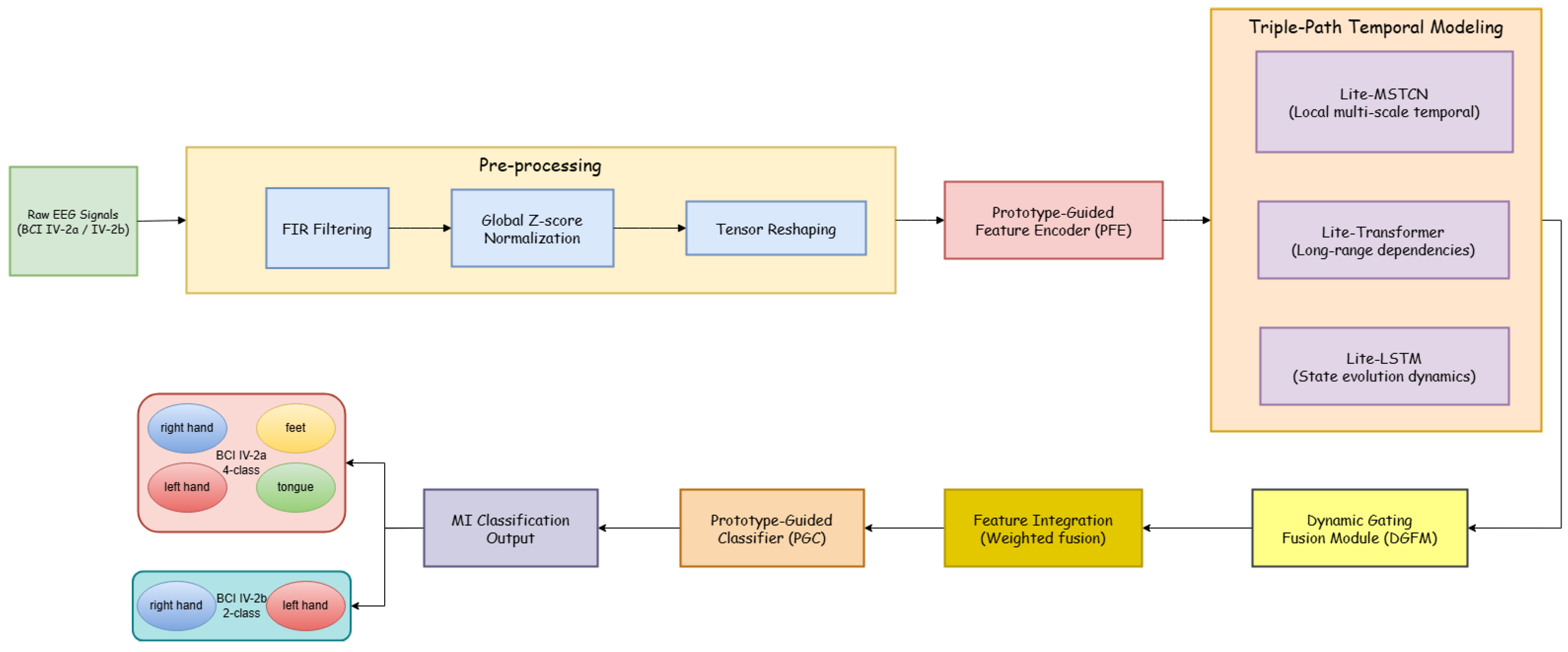 We introduce a synergistic triple-path temporal modeling mechanism that concurrently leverages TCN, Transformer, and LSTM. This approach holistically models the short-term, global, and state-evolutionary characteristics of EEG-MI signals, thereby enhancing the representational power of the model.