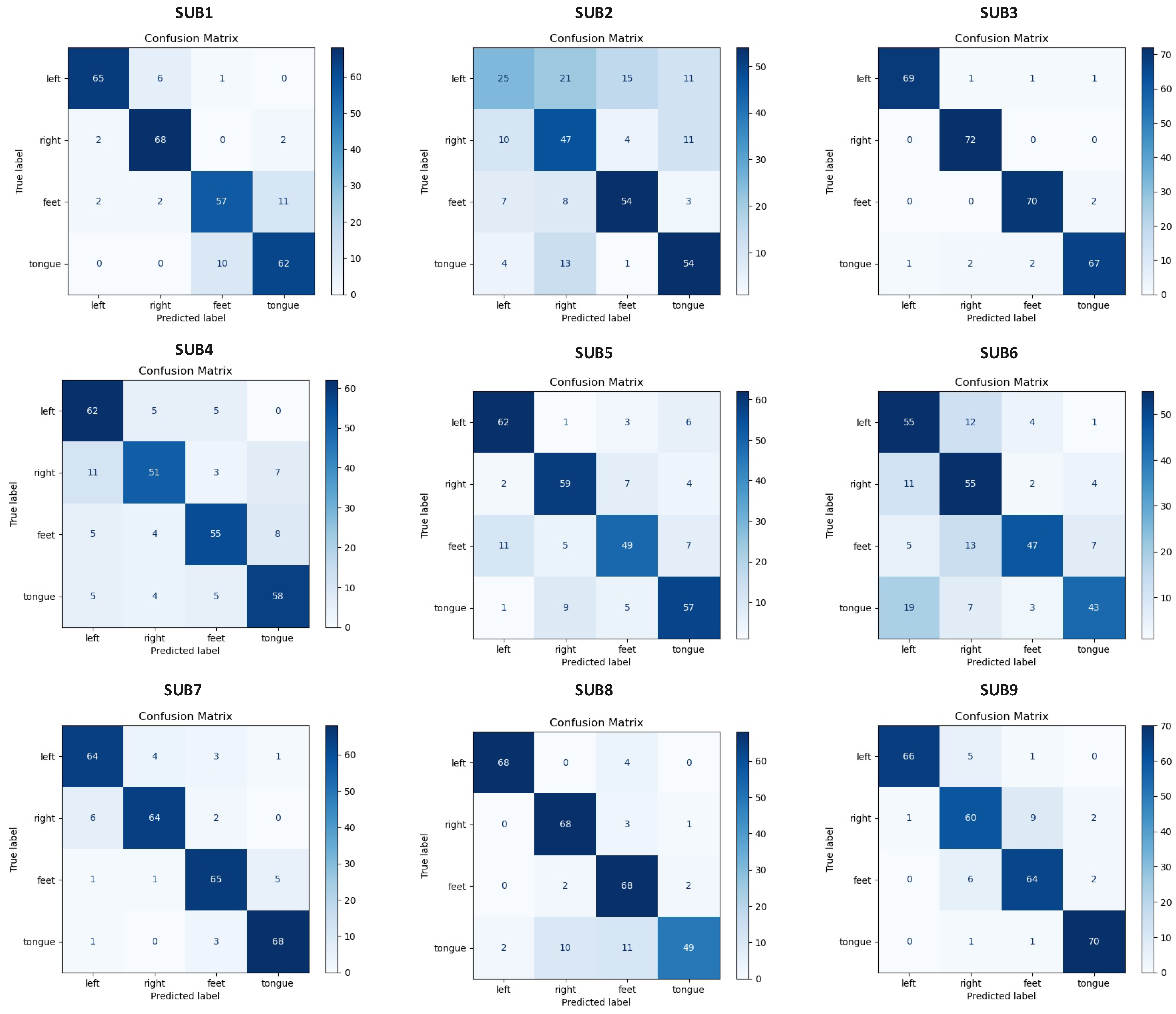 This research utilizes the BCI Competition IV-2a and IV-2b dataset, which, respectively, contain recordings from nine subjects. In BCI Competition IV-2a dataset, each subject completed 72 trials for four distinct MI tasks: left hand, right hand, feet, and tongue. Each trial comprises time samples recorded from EEG channels. Consequently, the labeled sample set for any given subject can be defined as , where is the data matrix of subject k for the i trial, is the corresponding class label from {left hand, right hand, feet, tongue}, and is the total number of trials per subject. In contrast, the BCI Competition IV-2b dataset also comprises EEG recordings from nine subjects but focuses on a binary MI classification task involving left-hand and right-hand imagery. For each trial, EEG signals are recorded over time samples recorded from EEG channels (C3, Cz, and C4), which are closely associated with motor-related cortical activity. The corresponding labeled sample set provides a complementary evaluation scenario characterized by limited spatial information.