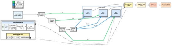 Detailed SRM module diagram. This figure provides the full block-level view of SRM (tokenization, cross-stage links, conditioning, scaling, and fusion), complementing the conceptual overview in Figure 1. Green arrows denote query (Q) flow, blue arrows denote key/value (K,V) flow, and gray arrows denote feature-map propagation; dotted connectors indicate zoomed insets for the SRM inner flow and gating constraints.