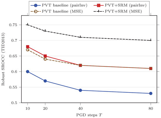 Primary evidence remains robust correlation under strong evaluation. The core empirical claim is supported by worst-case robust SROCC/PLCC under an explicit attack ensemble (Table 7 and Table 8), including correlation-aware objectives (Equation (32)), attack-strength sweeps (Figure 5), transfer sanity checks (Table 10), and EOT for stochastic variants when enabled (Section 3.8.4) [7,9,25].