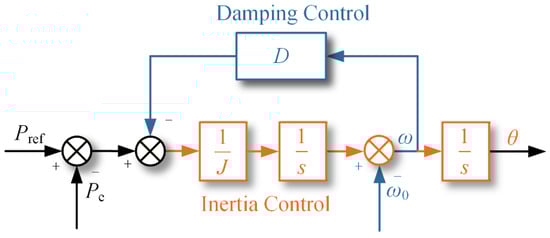 where J is the virtual inertia, ω is the angular frequency, ω0 is the rated angular frequency, Pref is the reference active power, Pe is the output active power, D is the damping coefficient, and θ is the internal voltage phase.