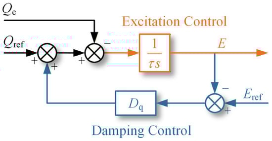where Eref is the reference voltage amplitude, Qref is the reference reactive power, Qe is the output reactive power, Dq is the reactive power droop coefficient, and τ is the reciprocal of the integrator gain.