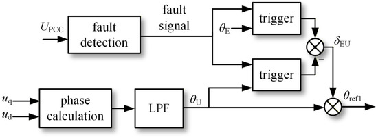 The control method for phase difference locking during severe faults is shown in Figure 11. The core idea is to cut off the traditional VSG frequency integration path for generating the internal voltage phase upon detecting a deep voltage sag, and to lock the phase difference between E and U. This can be divided into the voltage phase calculation and the phase difference locking. This process determines the reference internal voltage phase θref1 during the fault period.