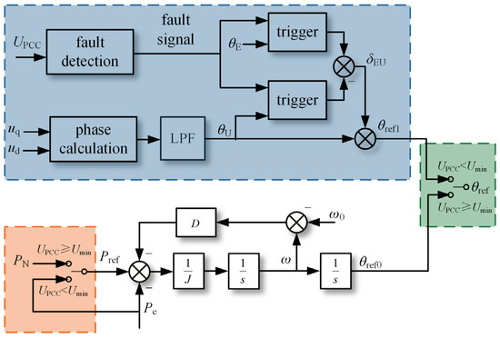 The phase in VSG control is generated by the P-f loop. Therefore, the switching phase θref0 after fault clearance needs to be derived from the integration of the P-f loop. During a fault, Pref is always greater than Pe, causing the frequency to increase. If the frequency integration is naturally generated, θref0 will diverge, and a large frequency difference after switching can also lead to instability. Therefore, special control of the P-f loop during faults is needed (Figure 12).