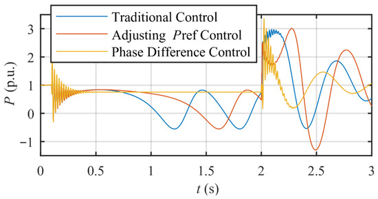 Under adjusting the Pref control, the converters near the fault (converters 3 and 4) reduced Pref. This delayed the rate of frequency and power angle divergence, and suppressed power oscillations during the fault. However, the maximum angular frequency deviation of converters 3 and 4 during the fault still reached 0.040 p.u. and 0.043 p.u., respectively. For the remote converters (converters 1 and 2), this strategy did not reduce the deviation in the active power and angular frequency during the fault period. After fault clearance, the sudden change in Pref caused noticeable secondary oscillations of all four converters. Especially for converters 3 and 4, the angular frequency deviation after the fault reached 0.173 p.u. and 0.133 p.u., respectively.