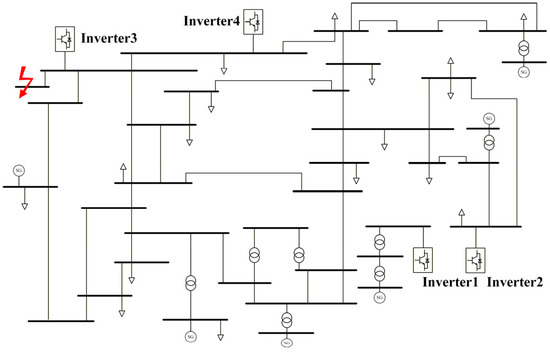 Simulation tests were conducted in the PowerFactory 39-bus case environment. In the original system, there were10 SGs, four of which were replaced with GFM converters. Figure 18 shows the topology of the 39-bus system. Converters 1 and 2 are far from the fault point, while converters 3 and 4 are close to the fault point. The control strategies discussed above were applied. The fault voltage threshold was set to 0.5 p.u. The parameters are listed in Table 4. The simulation duration was set to 1.4 s, with a three-phase short-circuit fault (Z = 10 Ω) occurring at 0.2 s and cleared at 0.5 s.