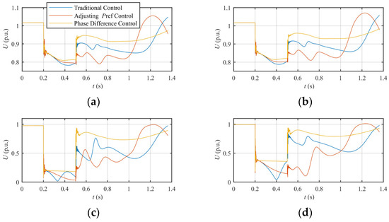 Under the phase difference control strategy, the converters responded based on the voltage sag. Converters 1 and 2 experienced shallow voltage sags, so they kept the traditional VSG control and provided active power support during the fault (Figure 23). The frequency deviation was controlled within a reasonable range, with maximum deviation values of 0.016 p.u. and 0.015 p.u., respectively, and it quickly converged after fault clearance. Converters 3 and 4 experienced deep voltage sags; the phase difference between E and U was locked. This prevented power angle divergence and kept their transient stability. After fault clearance, the maximum angular frequency deviation of converters 3 and 4 did not exceed 0.013 p.u. and 0.027 p.u., respectively, and quickly converged. This confirms that the control strategy can achieve smooth switching. Terminal voltage oscillations were also suppressed. This leads to coordinated stability at the grid level.