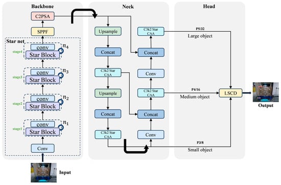 Structural layout of LSOD-YOLO, in which C3k2-Star-CAA consists of Star Block and CAA modules, and LSCD denotes the lightweight detection head.