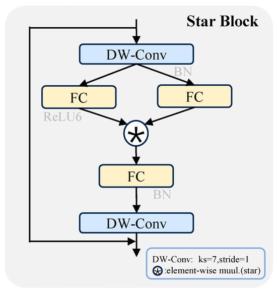 The backbone of StarNet consists of five stages: one input Stem layer and four cascaded layers from Stage 1 to Stage 4. The Stem layer is composed of a 3 × 3 convolution block and the ReLU6 activation function. It projects the three-channel RGB input into an initial feature space (base dim = 16) and performs the preliminary downsampling. Each stage first uses convolution with stride = 2 to finish the spatial downsampling and channel expansion. Then, it stacks multiple Star Block modules. The number of modules is set by the depth list (default is [1, 1, 3, 1]). Exhibiting a characteristic pyramidal hierarchy, this structure effectively captures multi-scale features, spanning from low-level spatial edges to high-level semantics.