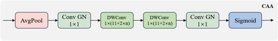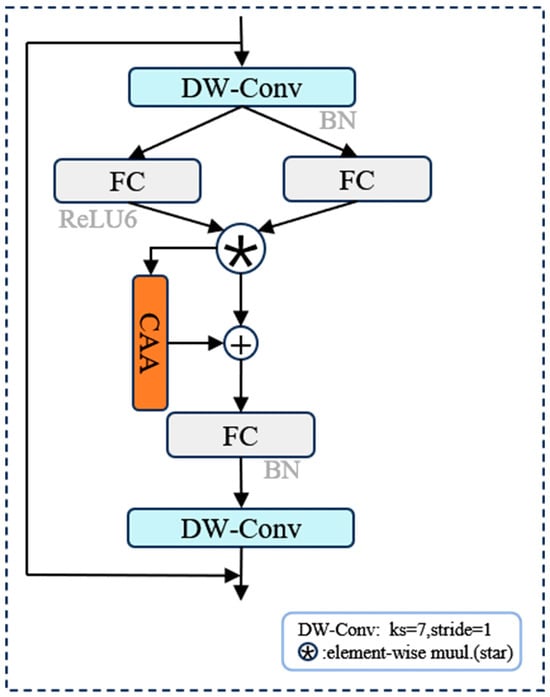 The Star Block CAA is the core unit of this module, which integrates the lightweight gating structure of StarNet and the direction-aware attention mechanism. On the basis of the Star Block, it introduces the CAA module to explicitly regulate the channel and spatial dimensions. The CAA module suppresses background noise through 7 × 7 average pooling, models horizontal and vertical dependencies via Stripe Conv, generates an attention map that integrates spatial awareness and directional discriminability, and completes feature response modulation through convolution and Sigmoid activation (its structure is detailed in Figure 8).