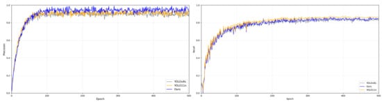 Figure 11 and Figure 12 illustrate the validation performance (Precision and Recall) recorded at the end of each training epoch. Although the metrics for LSOD-YOLO begin to stabilize around 200 epochs on the ZKLJ dataset and 300 epochs on COCO, we opted for a full 300/500 epoch schedule to ensure that the complex attention mechanisms (C3k2-Star-CAA) and the shared convolutional weights in the LSCD head achieved absolute convergence. This extended training duration also allowed us to verify the model’s stability and confirm the absence of significant overfitting in the later stages of the lightweight architecture’s development.