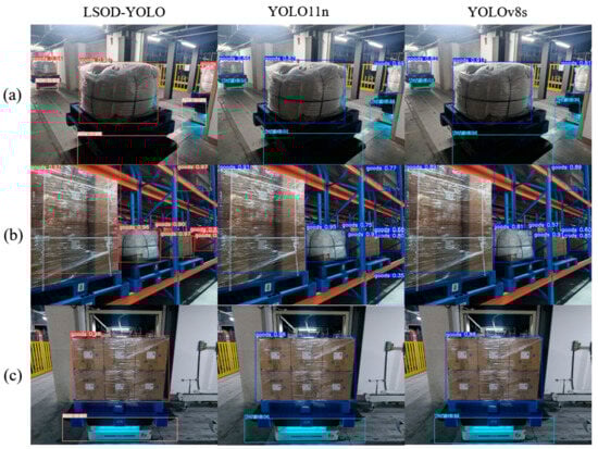 As shown in Table 5, the proposed LSOD-YOLO model outperforms the other three methods in the three metrics of Precision, Recall, and mAP, while maintaining the most compact parameter profile. This decisive advantage stems from the architectural synergy between the StarNet backbone, the C3k2-Star-CAA module, and the LSCD head. Together, these components facilitate robust feature extraction of AGVs while simultaneously curtailing computational overhead and improving overall detection fidelity.