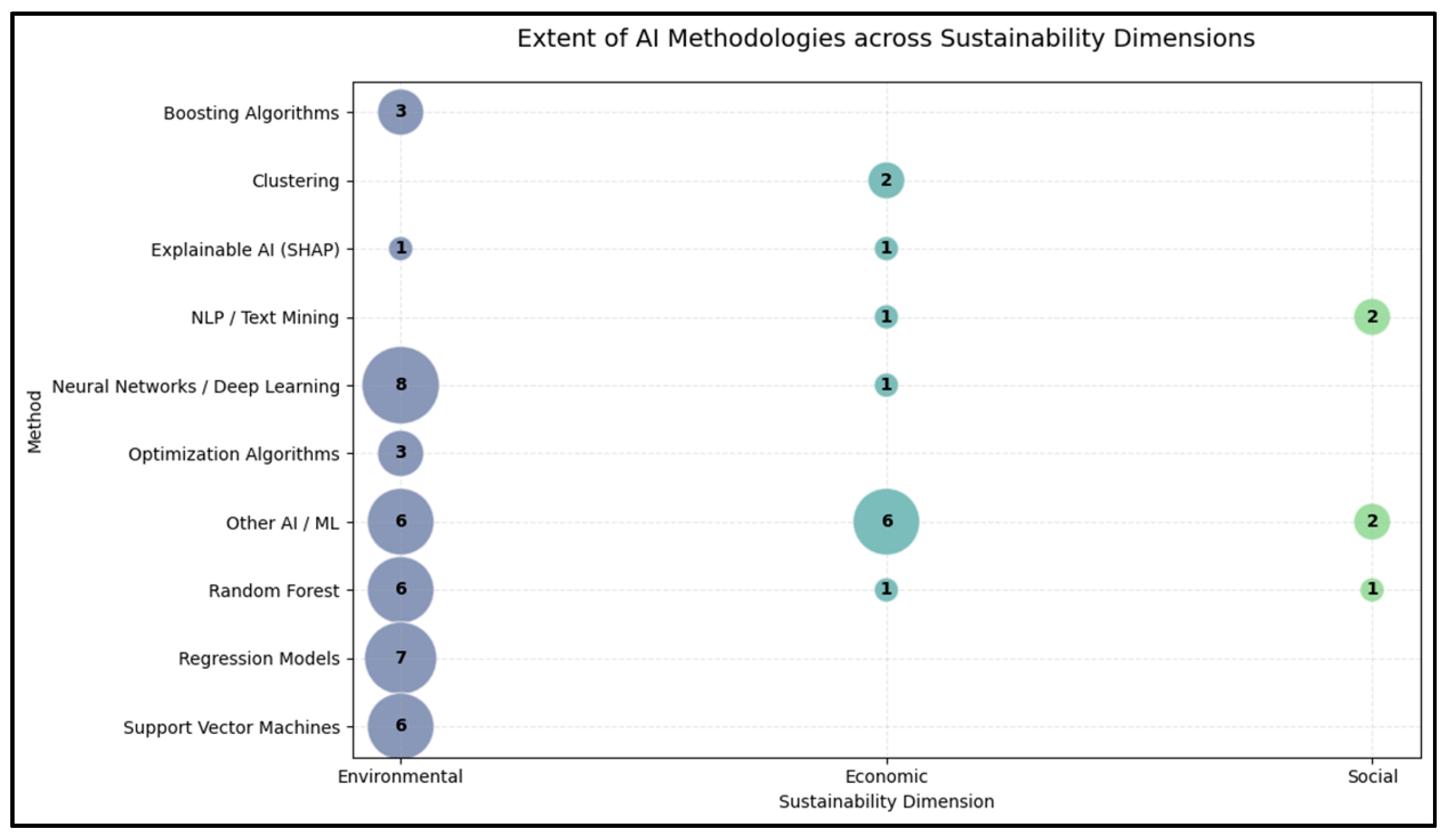 | AI Functional Role | AI Methodologies | Sustainability Dimension | Methodological Maturity |