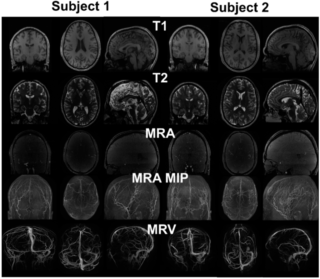 MRI images from two healthy subjects. T1 provides distinction of grey and white matter, skull and scalp. T2 provides cerebrospinal fluid space and contrast between gray and white matter. MRA enhances the intensity of vessels using flow phenomenon. The maximum intensity projection (MIP) provides better distinction of vasculature compared to the raw image. Due to the pulse sequence design, the brain tissue was removed from the MRV, showing only the signals from the vein.